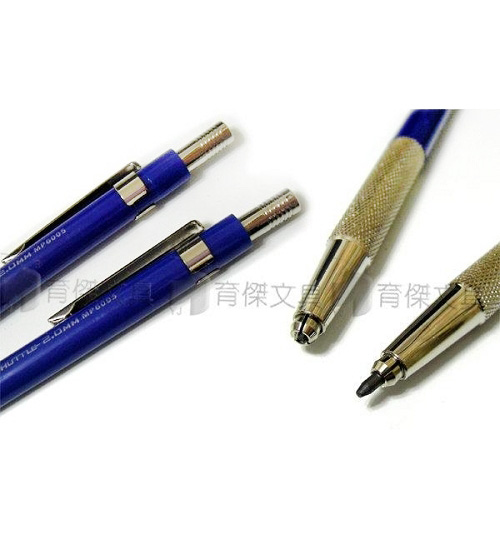 有金屬製的筆夾、按鈕與握筆區, 尾端按鈕內藏磨芯器可磨尖筆芯