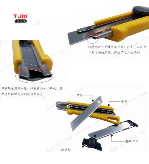 自動鎖定刀片功能;刀尾具有刀片折斷功能,刀片採用0.5mm高碳鋼材料,不易生鏽,韌性好、超鋒利。