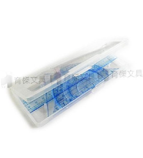 內含直尺, 三角板, 量角器;透明塑膠盒裝,方便收納攜帶 !
